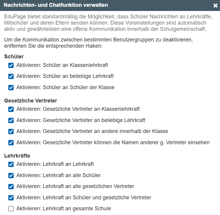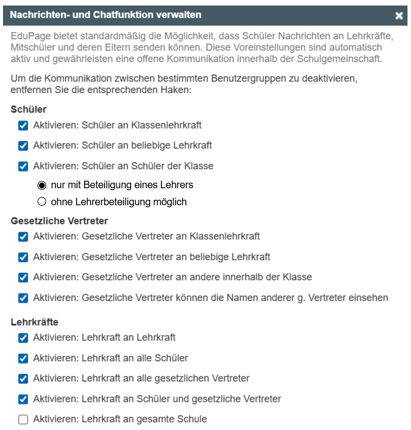 Schülern kann man das Recht geben, mit Klassenlehrern, beliebigen Lehrern oder auch Mitschülern zu chatten: