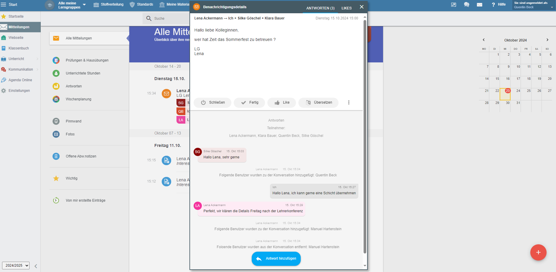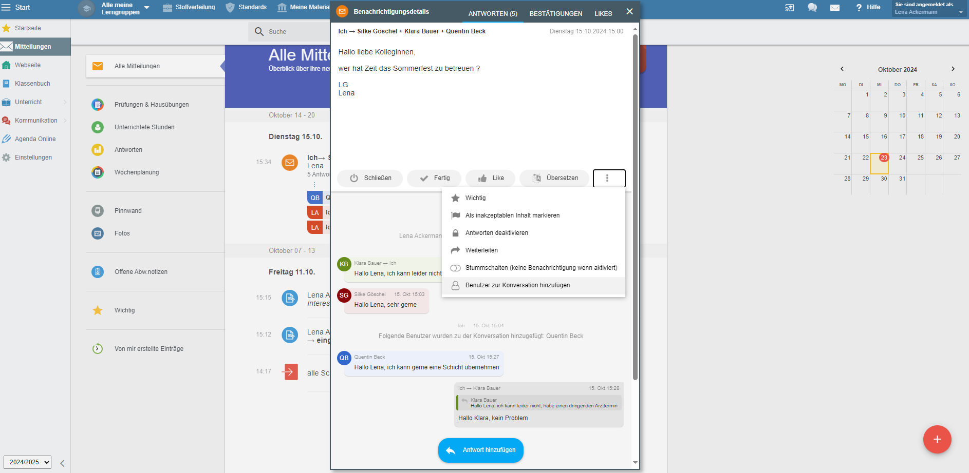 Mit unserer neuen Funktion wird die Verwaltung von Konversationen flexibler und effizienter. Bei Nachrichten können nun zusätzliche Personen nachträglich zur Konversation hinzugefügt werden, welche daraufhin Zugriff auf den kompletten Verlauf letzterer erhalten. Personen können ebenfalls aus der Konversation entfernt werden, falls Sie noch nicht geantwortet haben.
