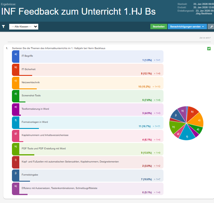 z.B. Kann man den Typ Reihenfolge bei Umfrage dafür nutzen, dass die Schüler die Punkte einer Liste nach eigenem Dafürhalten sortieren z.B. wenn man abfragen will, welche UR-Themen den Schülern am meisten auf den Nägeln brennen. Dann ist die Eingabereihenfolge der Themen auf der Karte keine Lösung, sondern nur eine Liste. Und das Ergebnis wird dann als Prozentzahl der Wichtigkeit ausgegeben:
