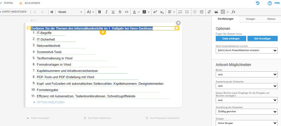 Aber für die anderen Fragetypen zb. die Sortierfrage geht es überhaupt nicht. (zB. Sortieren Sie die Unterrichtsinhalte nach Relevanz: Addieren, subtrahieren; Sortieren Sie die Unterrichtsinhalte nach ihrem Verständndiszuwachs: Addieren, Subtrahieren)