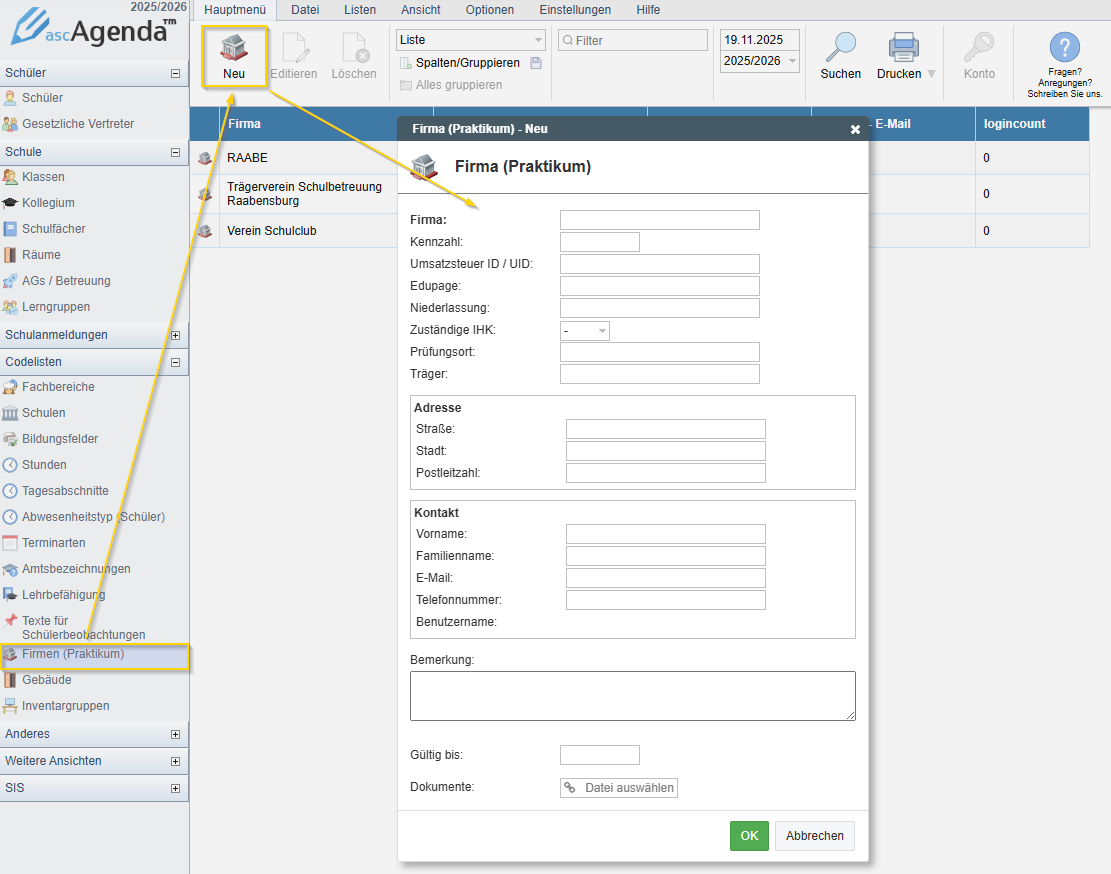 - Alternativ können Sie zu Agenda Online > Codelisten > Firmen (Praktikum) navigieren.