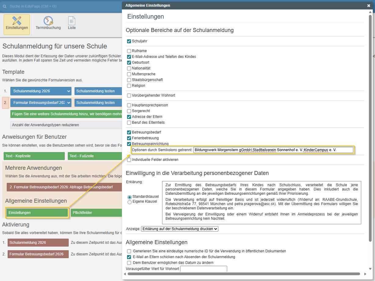 - Fügen Sie bei der Option Betreuungseinrichtung die Betreuungsoptionen hinzu, zwischen denen die zukünftigen Schüler bzw. deren gesetzliche Vertreter wählen können.