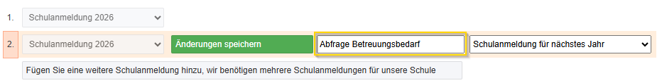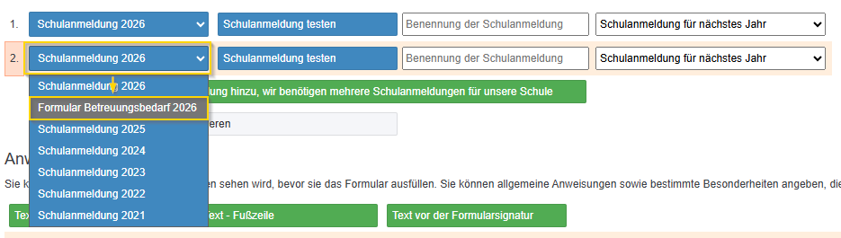 - Klicken Sie in der neu hinzugefügten, unteren Zeile auf Schulanmeldung [...] und wählen Sie stattdessen Formular Betreuungsbedarf [...] aus.