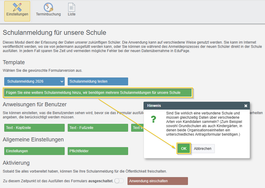 Damit die Schulanmeldung auf Ihrer EduPage-Website sichtbar ist und genutzt werden kann, sind zwei Einstellungen notwendig: