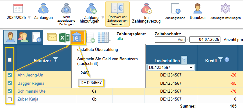 - Markieren Sie die Nutzer, für die Sie eine Lastschrift generieren möchten.