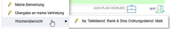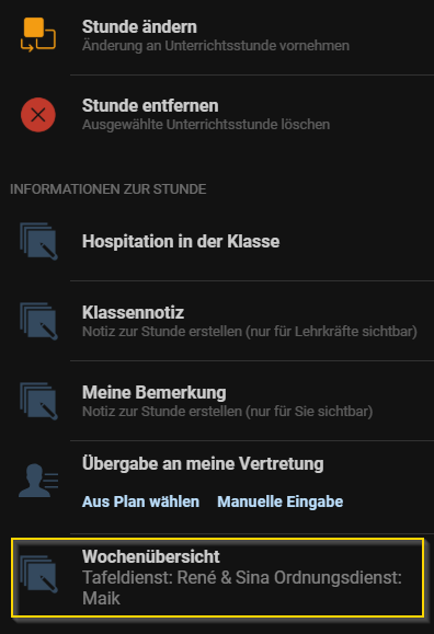 In der Wochenübersicht der Klassenbuchs einer Klasse können relevante Informationen wie bspw. Klassendienste o.ä. von der Klassenlehrkraft hinterlegt werden.