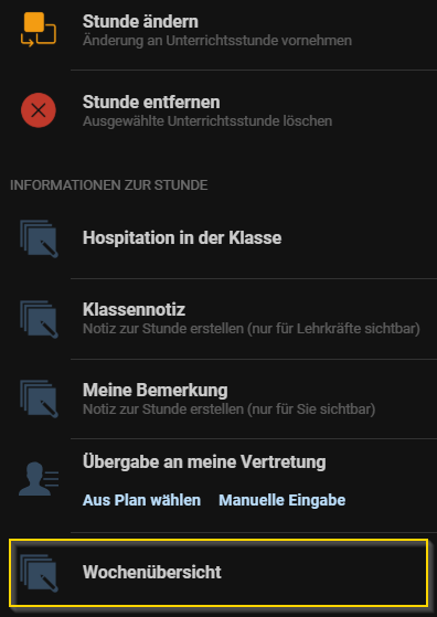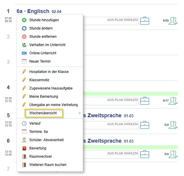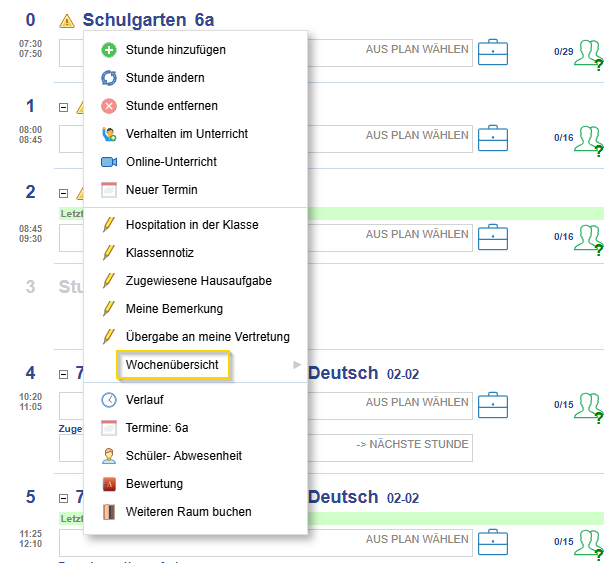 - Klicken Sie auf den Titel einer Stunde der gewünschten Klasse und wählen Sie Wochenübersicht.