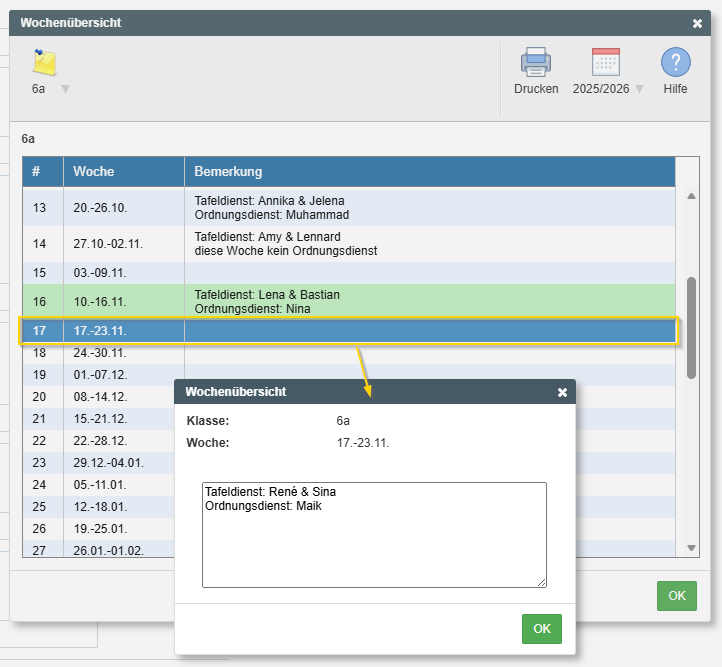 Klassenbuch: Wochenübersicht für Klassendienste etc.