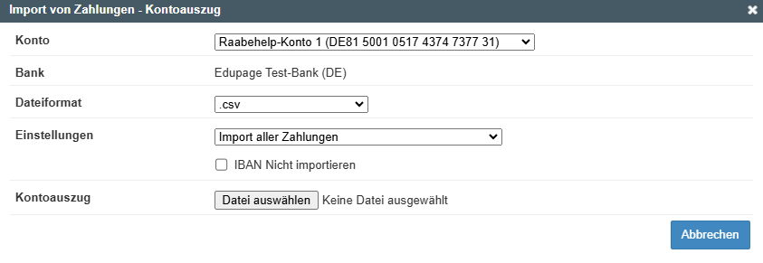 Die Bankverbindung und das Format des Kontoauszugs müssen einmalig hinterlegt werden. Wenden Sie sich diesbezüglich bitte an den