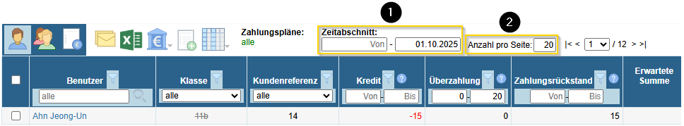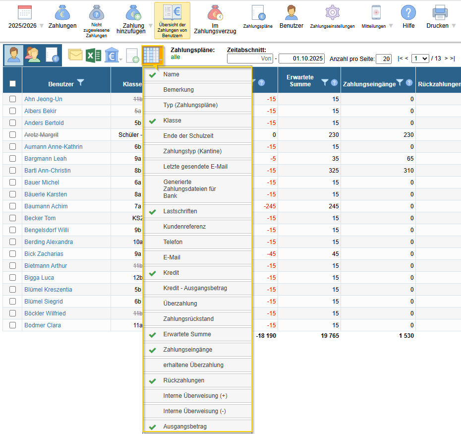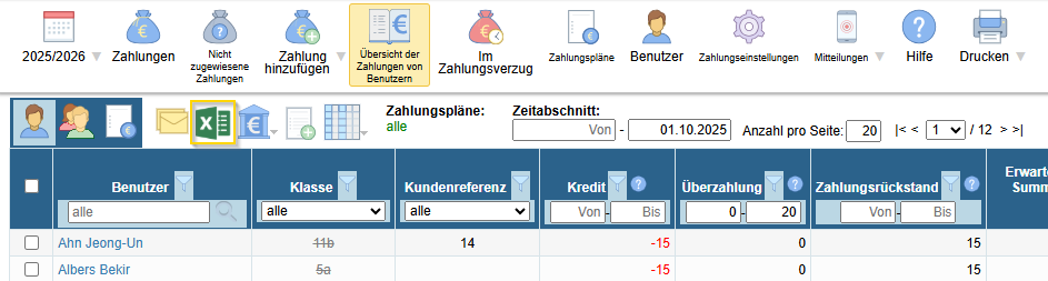 In der Übersicht der Zahlungen von Benutzern im Zahlungsmodul kann die aktuelle Ansicht angepasst und nach Excel exportiert werden.