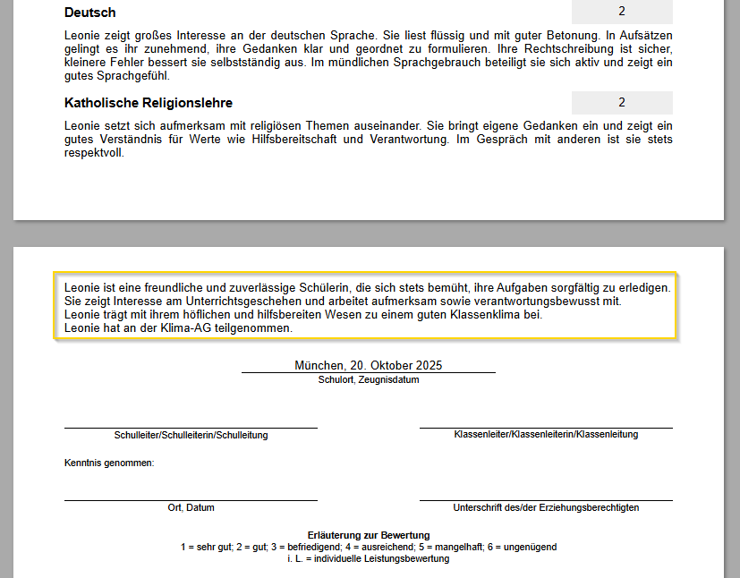 BAY-MS-013 | Jahreszeugnis für die Jahrgangsstufen 5 und 6 der Deutschklassen | Bereiche, s. Abschnitt 2.1 Bemerkungen, s. Abschnitt 2.2 ggf. Religion/Ethik, s. Abschnitt 2.8 |