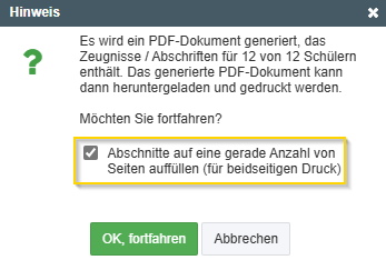 Falls Sie die Zeugnisse beidseitig drucken, haken Sie die Option Abschnitte auf eine gerade Anzahl von Seiten auffüllen [...] an. So wird bei Zeugnissen mit ungerader Seitenanzahl jeweils eine Leerseite eingefügt.