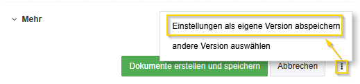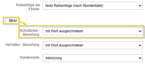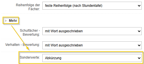 Bei der Zeugniserstellung kann im linken Seitenmenü unter Mehr ausgewählt werden, ob die Sonderwerte ausgeschrieben oder als Abkürzung angegeben werden sollen.