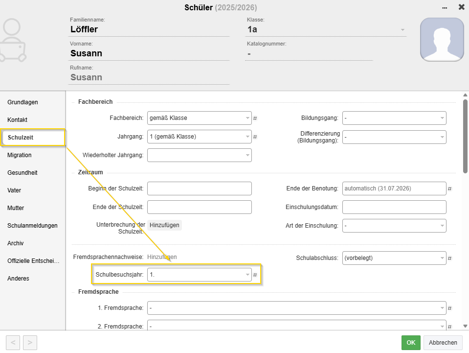 Das Schulbesuchsjahr wird automatisch übernommen, insofern es in Agenda Online im Datensatz des jeweiligen Schülers im Bereich Schulzeit hinterlegt ist: