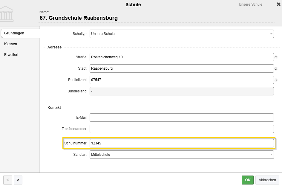 Damit die Schulnummer automatisch übernommen wird, muss diese in Agenda Online > Codelisten > Schulen bei der als Unsere Schule gekennzeichneten Schule hinterlegt sein: